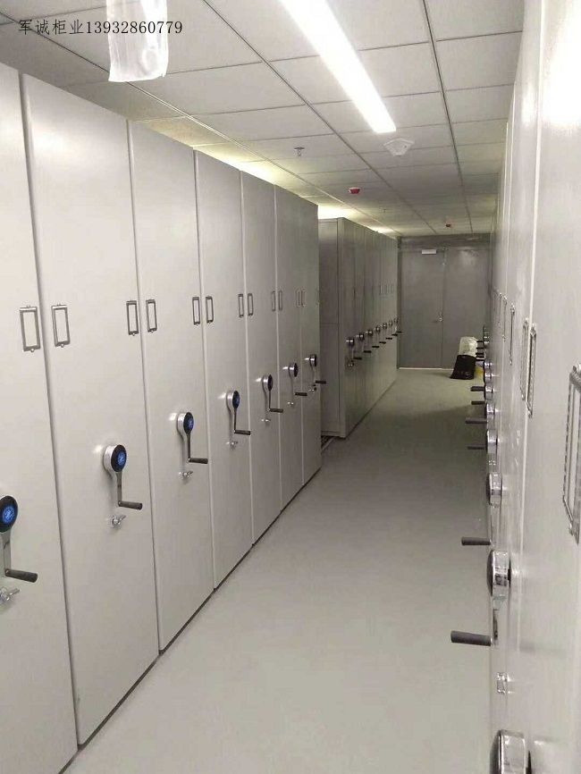 底架为分段组合式,加工精度高,具有对接互换性,便于运输和安装,并设有防倾倒装置,防止架体倾倒。路轨采用20*20(mm)45#实心方钢,路轨顶端设有限位装置,防止底盘脱轨。路轨保护板采用3.0mm热轧钢板,轨盒宽110mm,背面焊接,使之在承重2000KG时不变型。搁板(AB双面)均衡载重超过80KG,搁板采用三折弯工艺,增大其承载能力,层板与固定型孔<2.0mm。搁板采用整体板材,层间距可任意调整,门板采用豪华门结构。