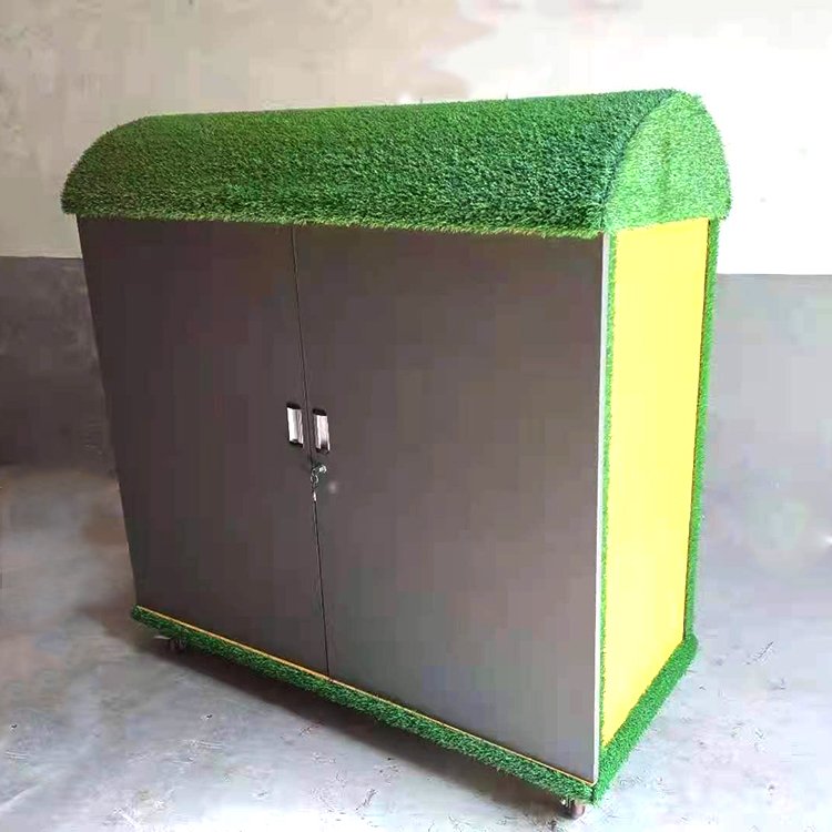涂鸦柜的顶部粘贴草坪固定,底部四个万向轮子移动
